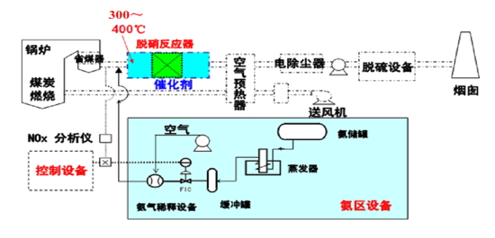 SCR脱硝系统一般由氨的储存系统、氨与空气混合系统、氨气喷入系统、反应器系统、检测控制系统等组成。