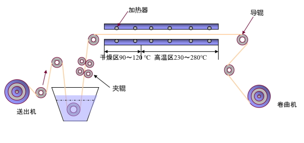 Impregnation is to immerse PTFE emulsion into the needle felt, so that PTFE granules are coated on the fiber surface and embedded into the pores, thus improving the surface and structural properties of the needle felt. PTFE emulsion is made of TFE emulsion polymerization, consisting of PTFE particles, non-ionic surfactant (to disperse PTFE particles and increase wettability), PFOA (perfluorooctanoic acid ammonium), ammonia (to prevent pH too low, non-ionic surfactant is engulfed by bacteria) and deionized water.