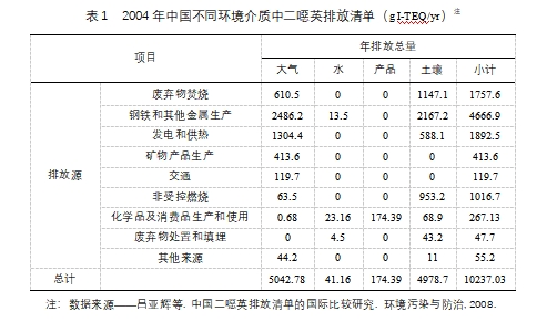 据统计,2004年中国各类来源的PCDD/Fs 的排放总量为10.2 kg I-TEQ(见表1),其中向空气排放5.0 kg I-TEQ,向水体中排放了0.041 kg I-TEQ,通过产品排放0.17 kg I-TEQ,向土壤中排放了5.0 kg I-TEQ。在所有排放源中,金属冶炼排放二噁英的量最大,占45.6 %,其次是发电和供热,第三是废物焚烧,这三类源排放量合计占到了总排放量的81 %。大气环境中的二噁英来源复杂,主要产生于钢铁冶炼、有色金属冶炼、汽车尾气、焚烧生产(包括医药废水焚烧、化工厂的废物焚烧、生活垃圾焚烧、燃煤电厂等)等过程。