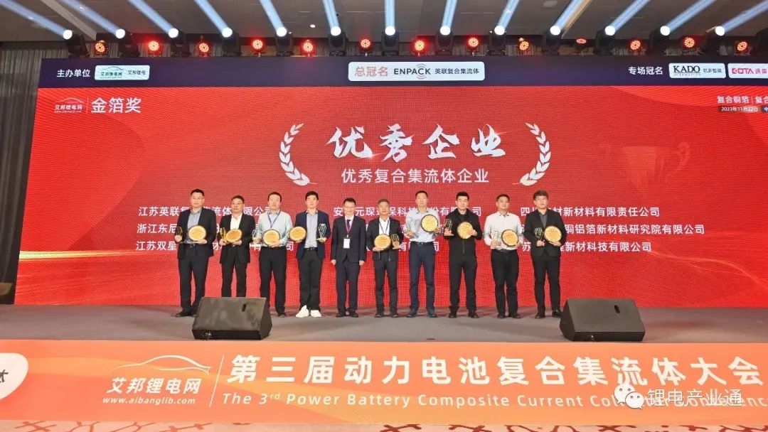 自此次评选活动开展5个月来,共有近60家企业积极报名参加,经过网络人气投票以及专家评审等多个环节,在第三届动力电池复合集流体大会上金年会体育科技被评为“2023年复合集流体优秀企业”。