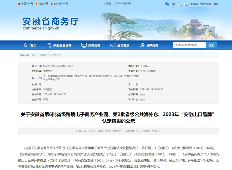 近日,安徽省商务厅公布2023年“安徽出口品牌”认定名单, 此次评选全省共44家企业,54个品牌获得认定,金年会体育科技“