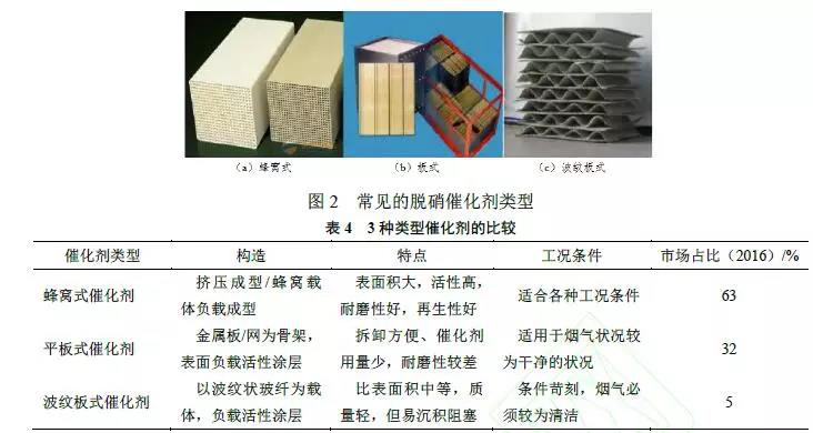 SCR可按外形分为3大类:蜂窝式、板式、波纹式。这3类都是适用于工业烟气流量大、含尘量高的整体性催化剂,其大致外观如图2所示。3类催化剂在国内外市场都有实际应用,但不同类型催化剂的特点、适用范围及成型工艺导致其在国内外市场所占份额差距悬殊。其中,蜂窝式SCR催化剂市场占比超过6成,其次是板式催化剂,波纹板式只占极少部分。这3类催化剂的特点和应用范围如表4所示。